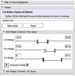 | + | * "ROI Widget Controls: RAS Space" frame: contains sliders to initialize VOI in RAS (physical) space | ||