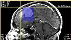 | + | * the pathology area is characterized by bright image intensities (contrast-enhanced meningioma MRI) | ||