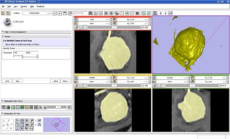 | − | |Use threshold control slider to find the intensity that most closely approximates tumor volume. | + | |Use threshold control slider to find the intensity that most closely approximates tumor volume. Thresholded volume is rendered interactively in the 3D viewer as you are adjusting the threshold value, and is also visualized as semi-transparent label in the image slice viewers. |
