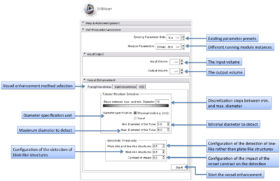 | − | The VMTKVesselEnhancement module | + | The graphical user interface of the VMTKVesselEnhancement module consists of two panels. |