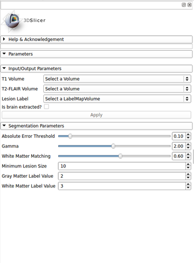This module offers an implementation of a recent Multiple Sclerosis lesion segmentation approach based on a unsupervised method described by Cabezas et al. [1]. This module is intended to be used with FLAIR and T1 MRI volumes, which the MS lesions can be detected.