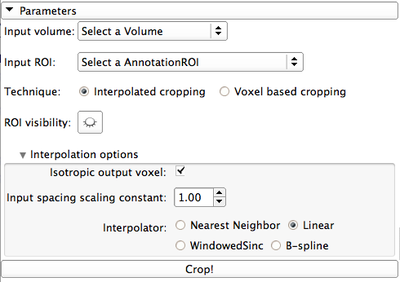 - Interpolator allows to select between Nearest Neighbor, Linear, Windowed Sinc or B-spline interpolators (see Resample Scalar/Vector/DWI Volume for details). For subvolumes being extracted from a label volume, you should use Nearest Neighbor interpolator. Otherwise B-spline is the preferred choice. Linear interpolator requires less computation, which may be important for very large ROIs.