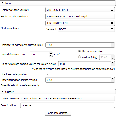 The DoseComparison module computes the difference between two co-registered dose volumes using the gamma dose distribution comparison method. This module uses the gamma Plastimatch algorithm internally.